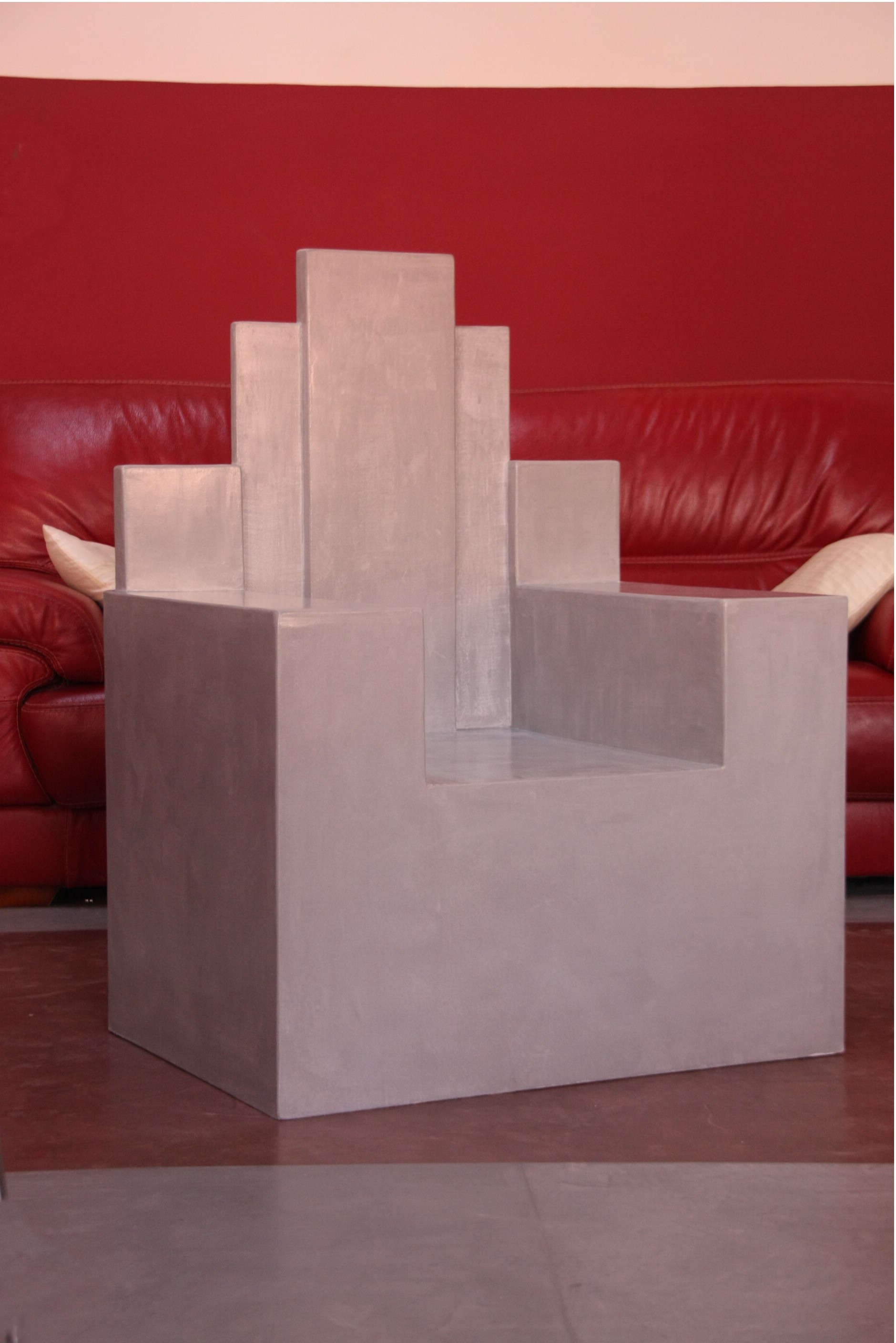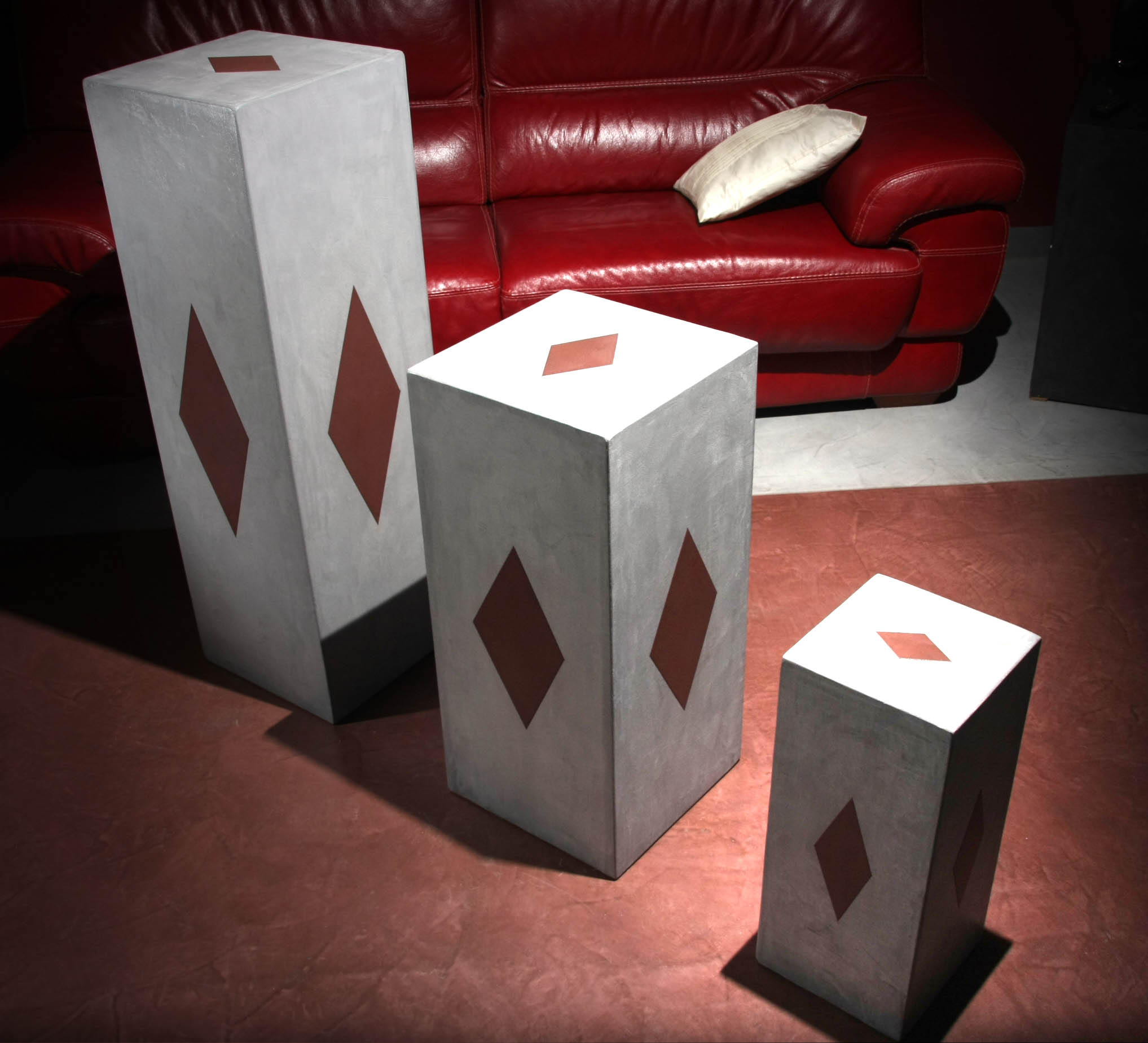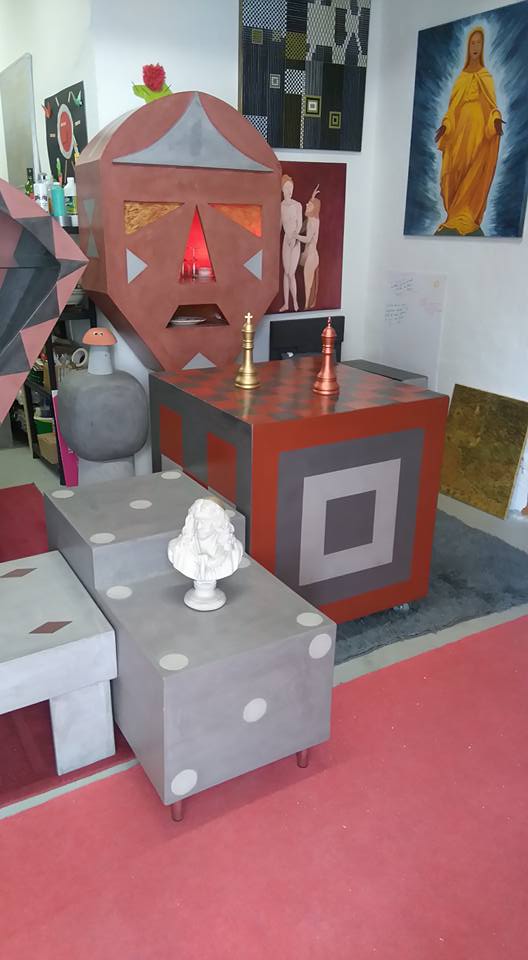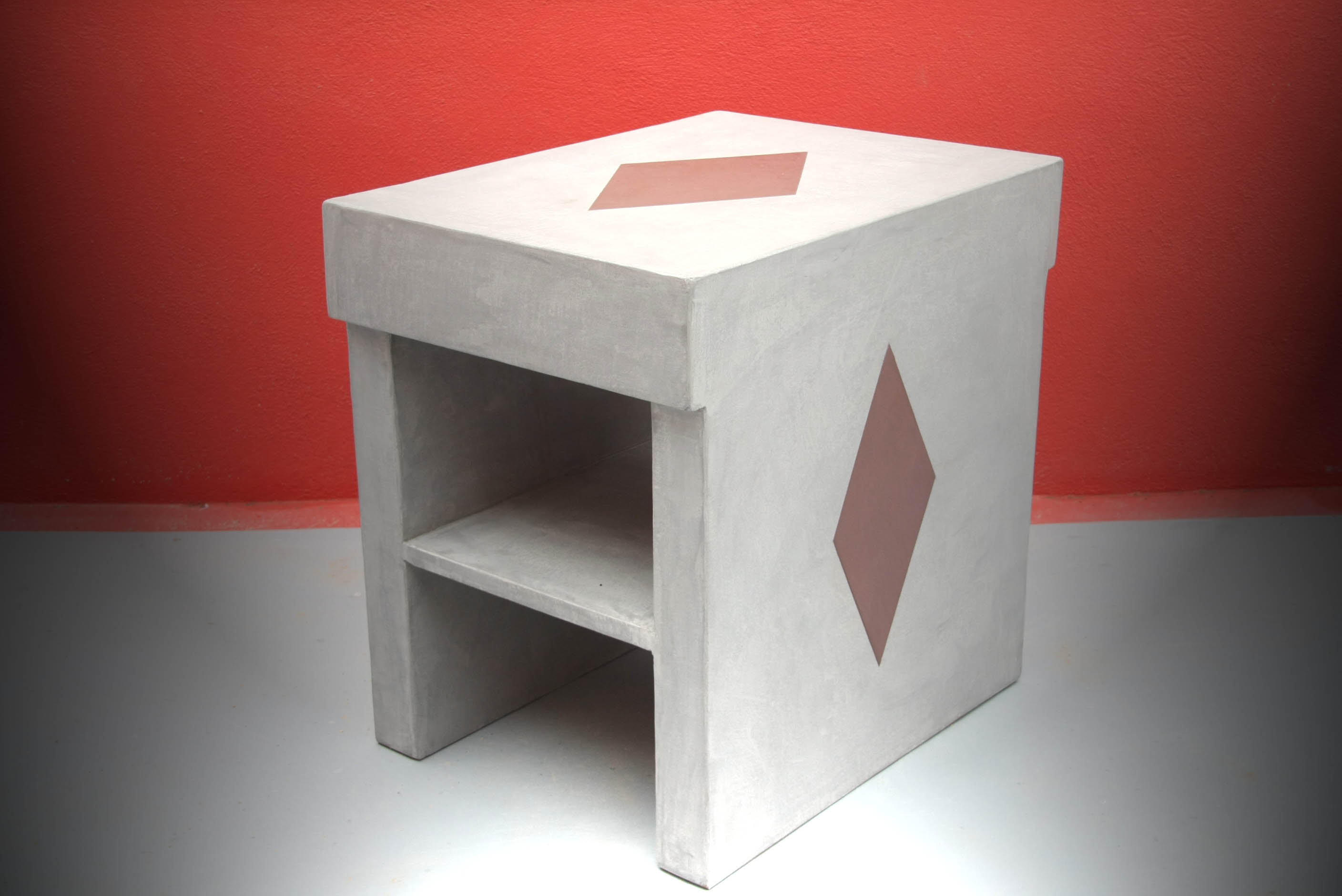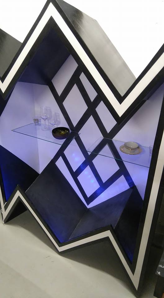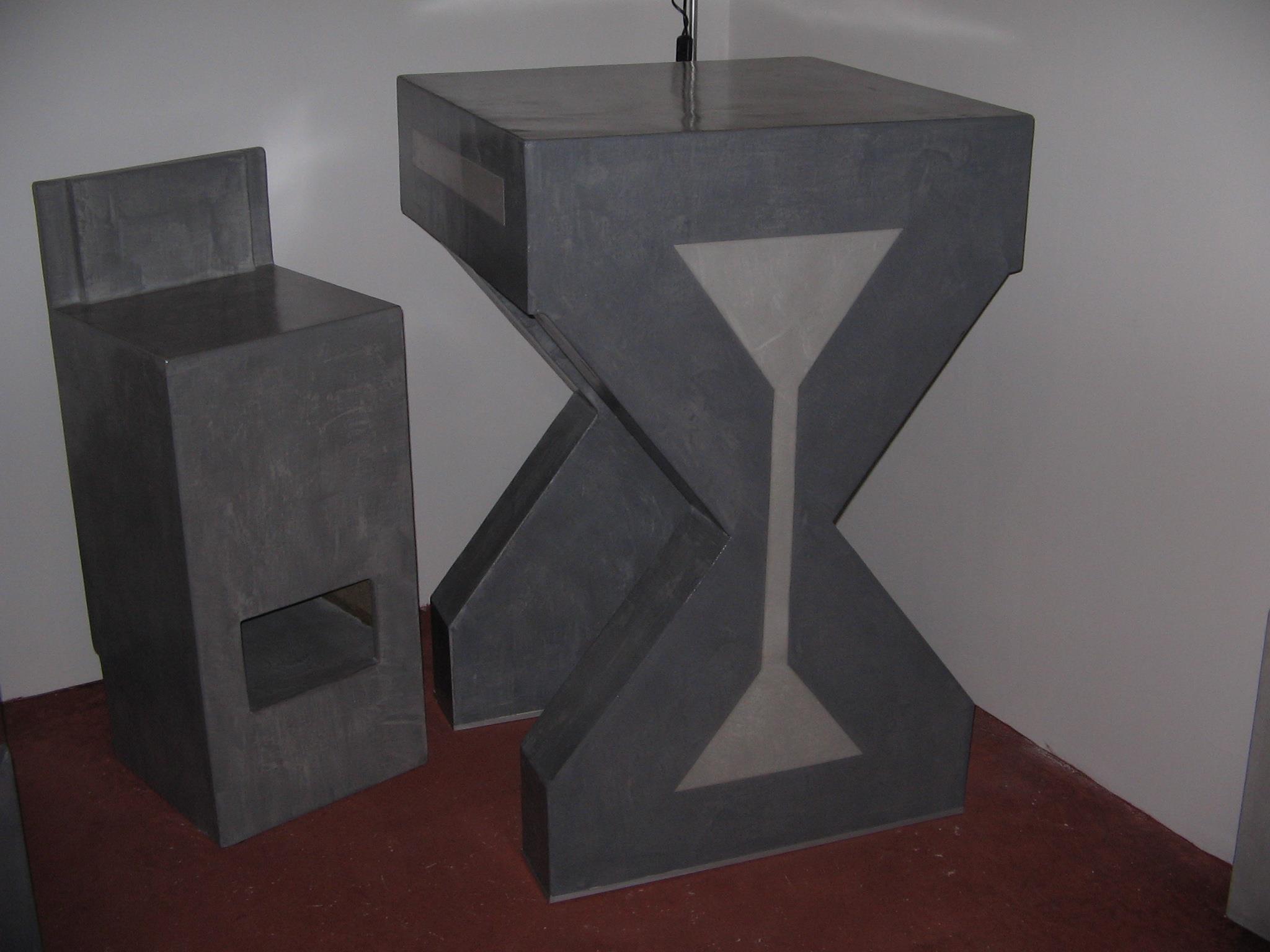 Table basse Console Siège trône Table basse Colonnes Mange debout Chevet Table et siège Sablier Fauteuil Molière Tête pas net Cube incrustation béton Echoppe Vitrine Meuble étoiles – vue de face Meuble étoiles – vue lumière bleue