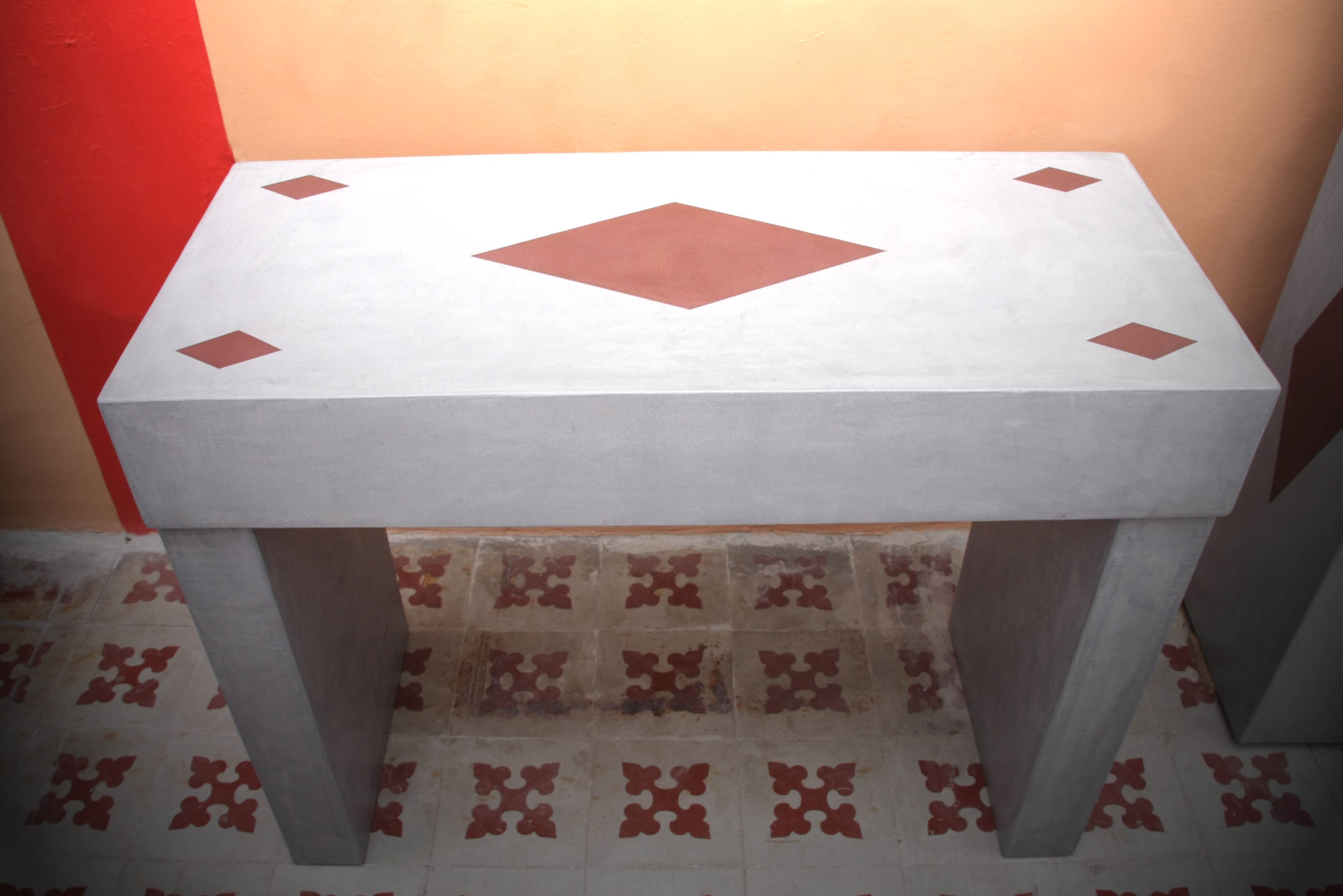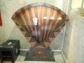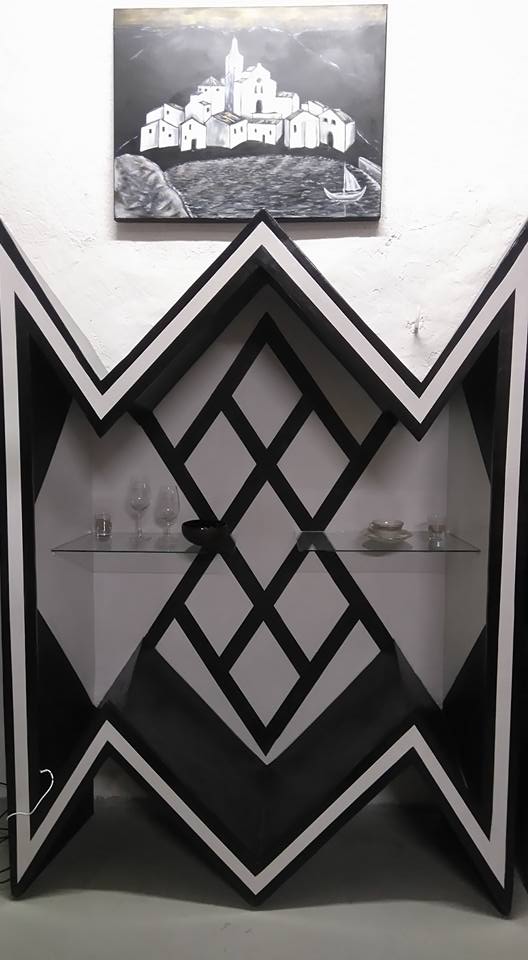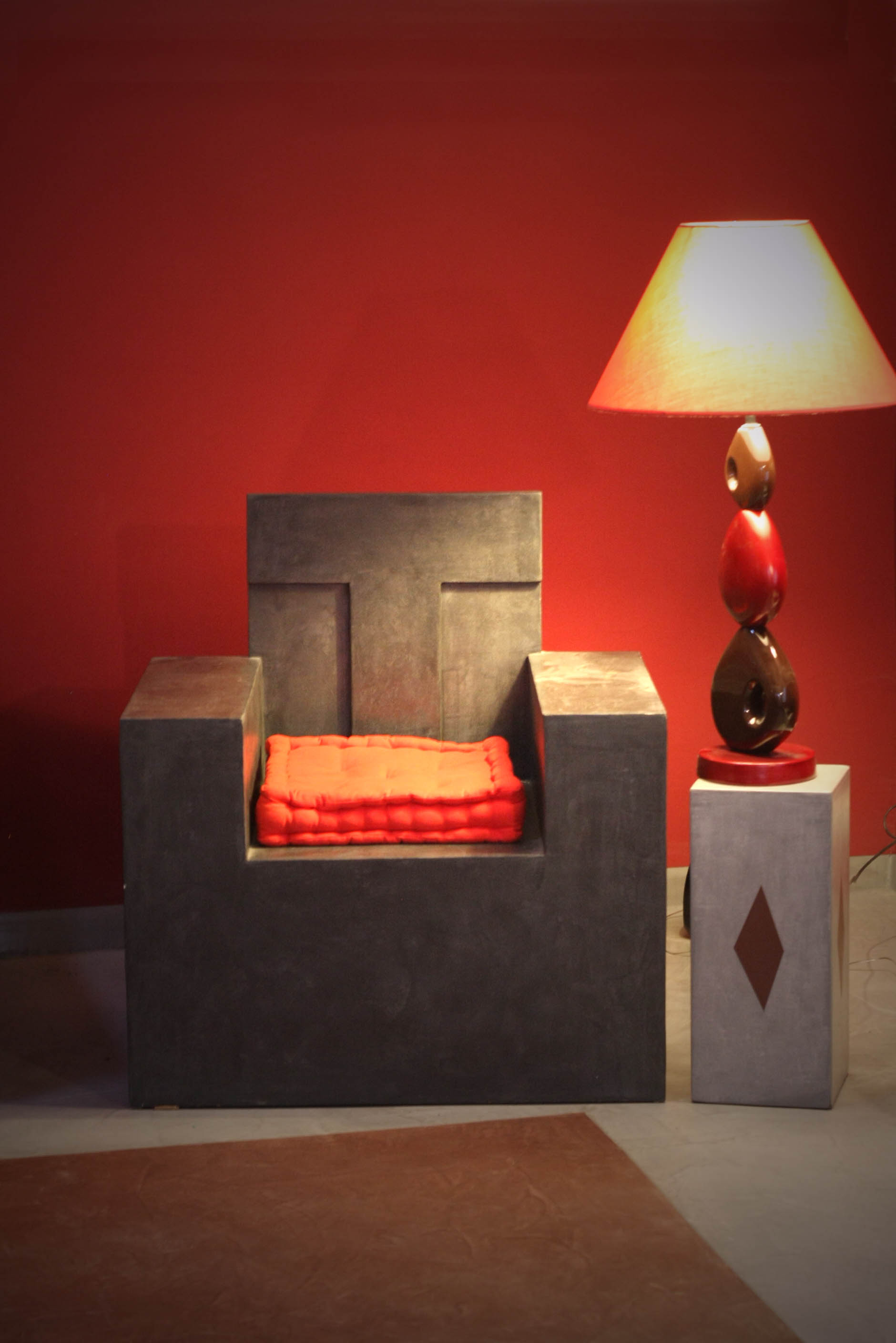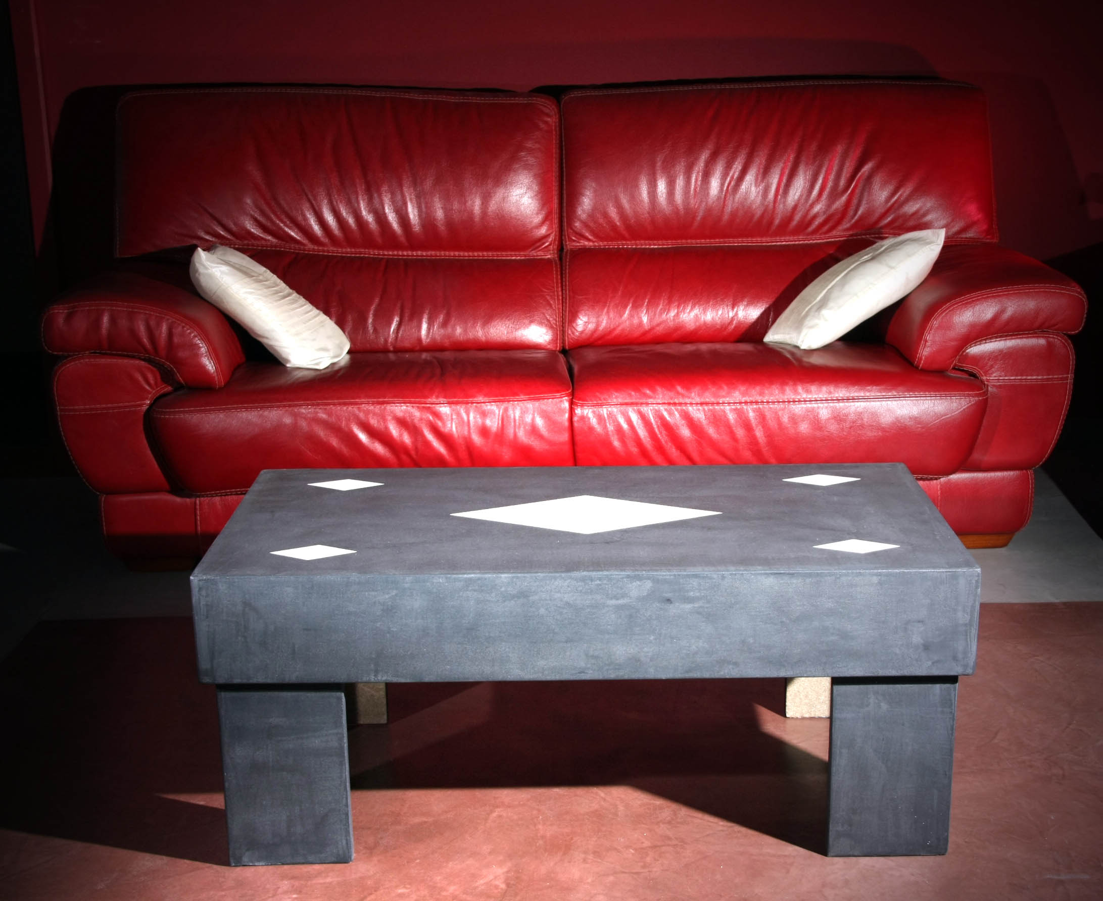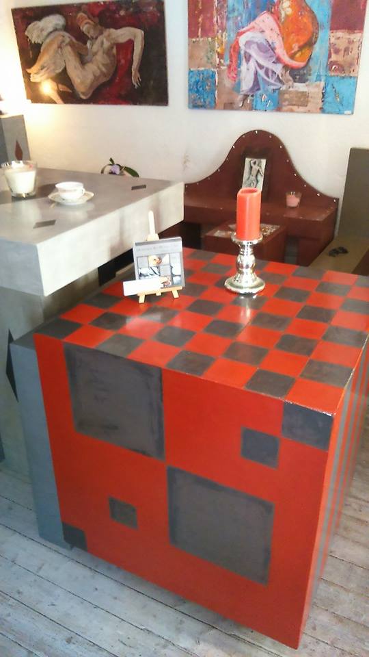 Table basse Console Siège trône Table basse Colonnes Mange debout Chevet Table et siège Sablier Fauteuil Molière Tête pas net Cube incrustation béton Echoppe Vitrine Meuble étoiles – vue de face Meuble étoiles – vue lumière bleue